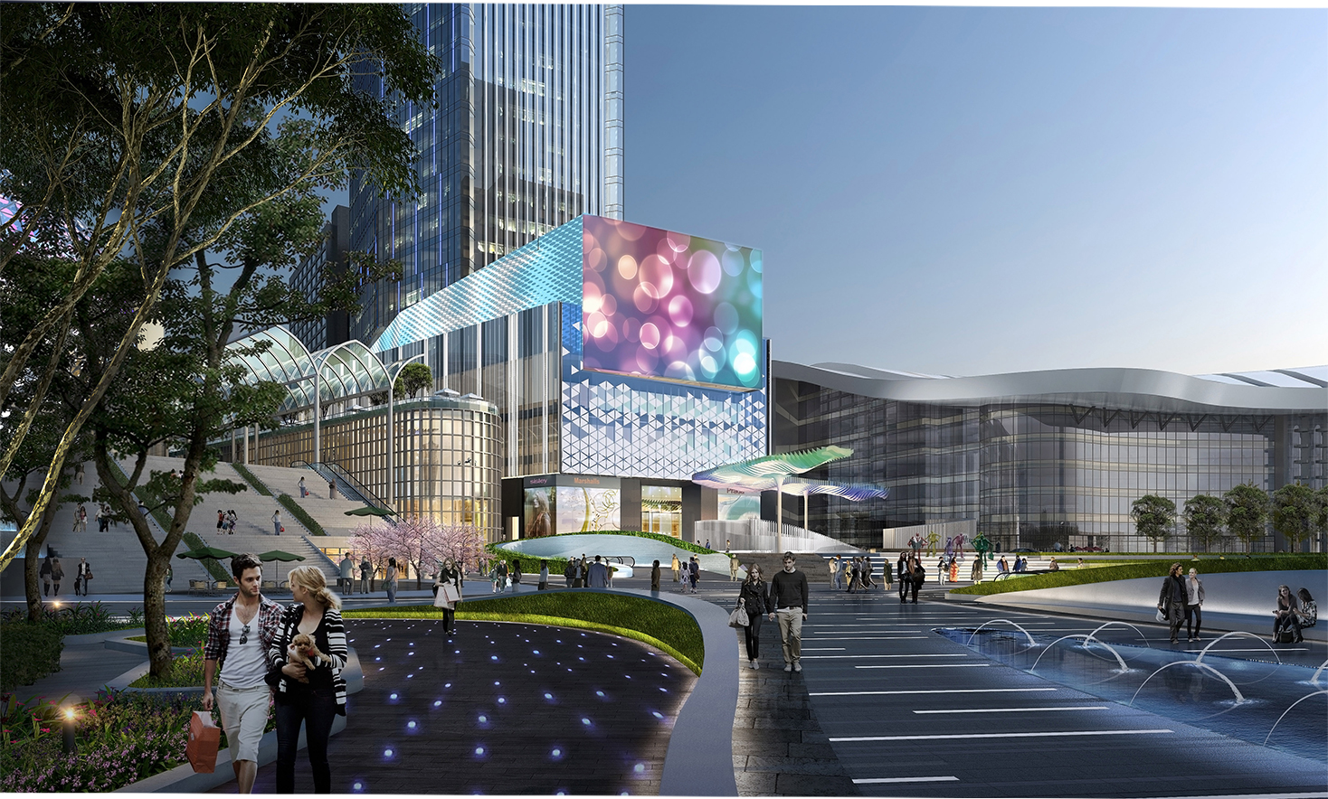 設(shè)置下層廣場與地鐵站無縫對接;設(shè)置商業(yè)連廊,放大主要出入口,在主要位置放置 LED 電子屏裝點入口廣場;設(shè)計立體交通以匯聚光谷廣場地上地下以及一期步行街人流;屋頂造型獨特。設(shè)計師通過一系列方式體現(xiàn)“光”的概念,力圖讓每一個經(jīng)過光谷廣場的人都能感受其特點,從而打造一道全新的城市亮麗風(fēng)景線。