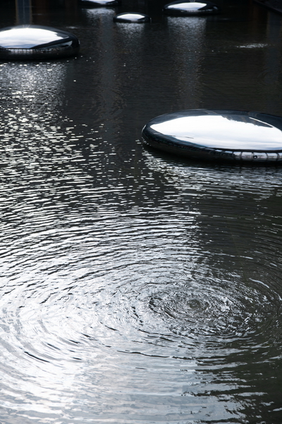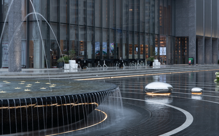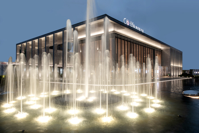 建筑倒映在鏡面水上,輝煌璀璨;星光點(diǎn)點(diǎn)的水池中貼合水面的不銹鋼水滴雕塑群忽明忽暗,如同呼吸的節(jié)奏;霧森如夢(mèng)似幻;漣漪涌泉帶著慢慢蕩開的哲思靜靜地噴涌。
