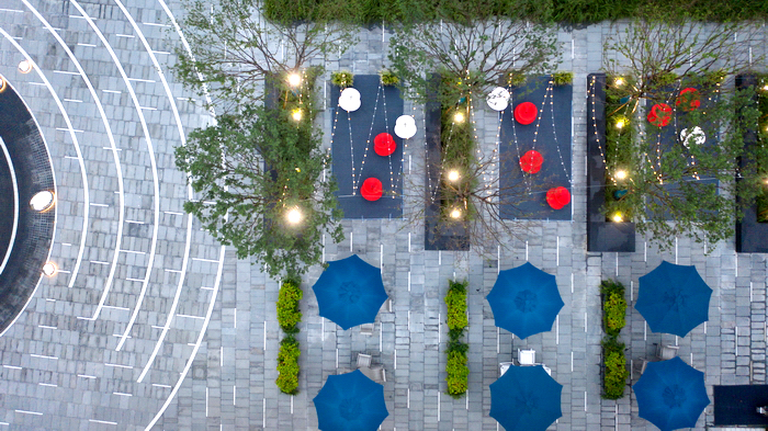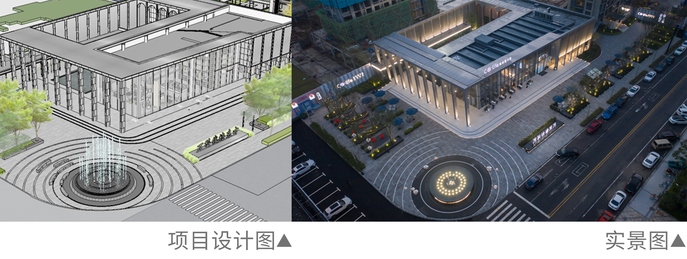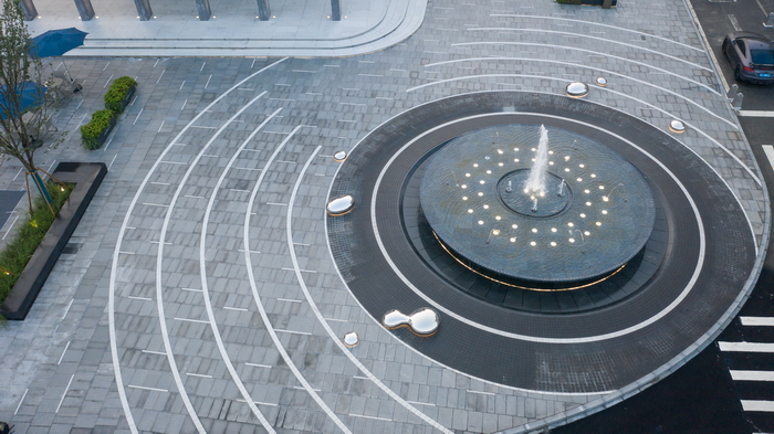 作為從下沙奧萊方向進(jìn)入場(chǎng)地的主要到達(dá)點(diǎn),我們以發(fā)散的同心圓承接住較為剛硬的建筑角部,疆界自然圓融地向外拓展,開放出一個(gè)如同打開雙臂呈迎接狀的“引力口袋”。以紐約林肯中心為設(shè)計(jì)靈感的直徑8.2米的互動(dòng)引力噴泉水盤中,三種不同形態(tài)的噴泉交相輝映,形成熱烈歡快的迎賓氛圍,晶瑩璀璨的鏡面不銹鋼水滴藝術(shù)小品散落四周,營造藝術(shù)互動(dòng)情趣。