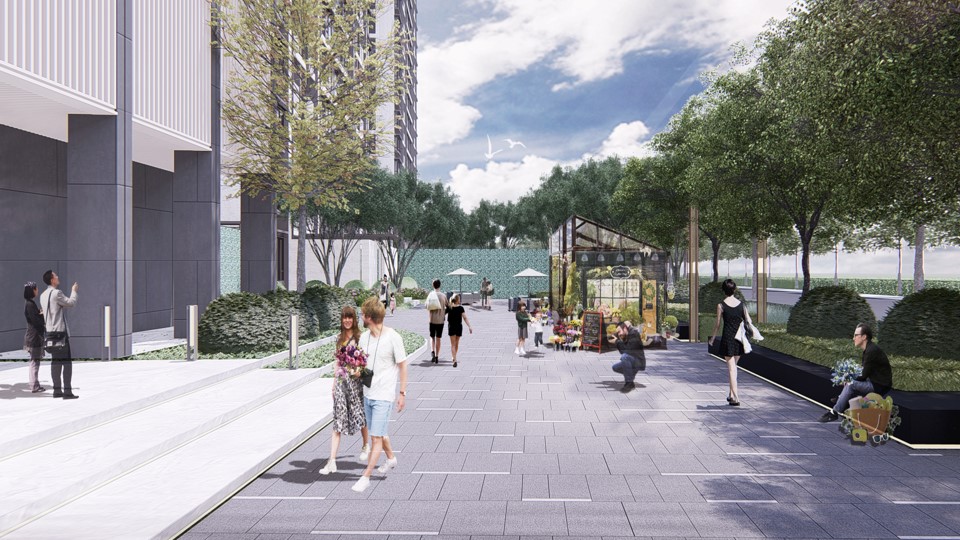 從 “引力口袋”外延的兩翼,黑色特色座墻結(jié)合種植池的做法作為一個(gè)重復(fù)元素形成同建筑節(jié)奏相匹配的序列感。