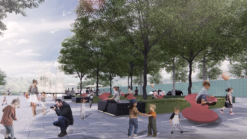 水盤周圈石材的特色處理形成珍珠一般垂落的串串水線,夜晚在地埋環(huán)形燈帶的映襯下,更如皇冠般熠熠生輝。水盤的設(shè)計(jì)也并非只能遠(yuǎn)觀不可褻玩,小朋友和水盤的近身互動(dòng)也是未來充滿活力和溫度的生活場(chǎng)景。