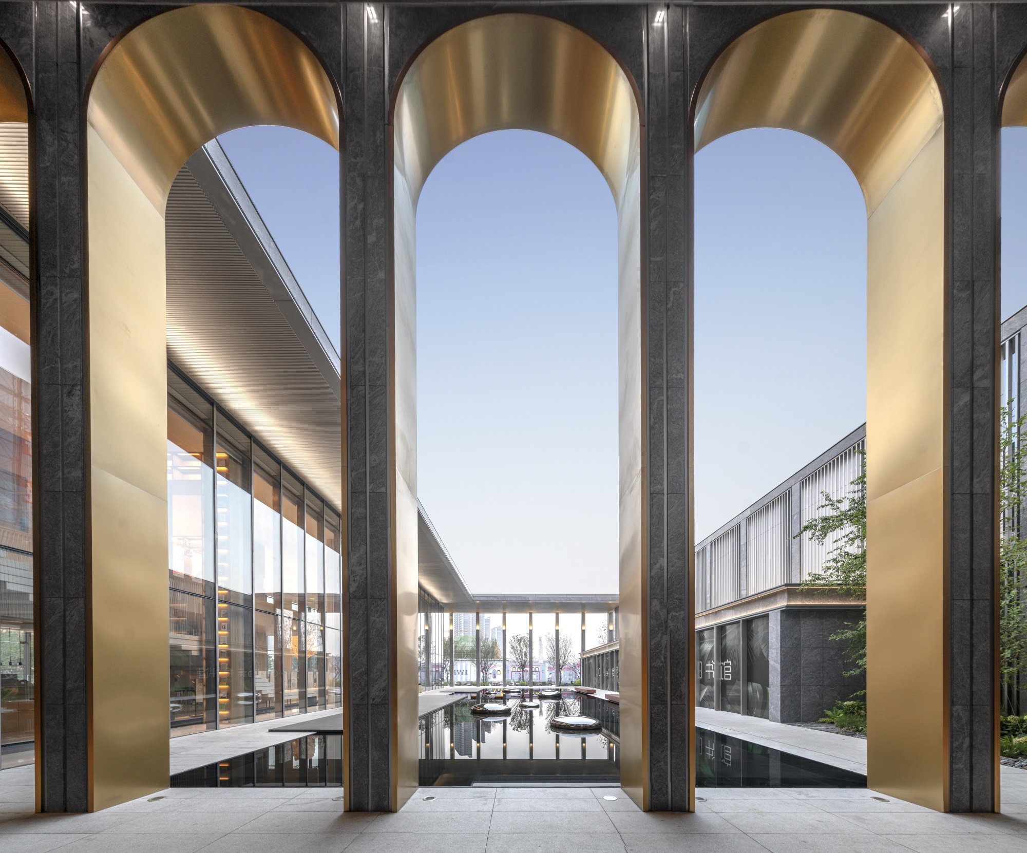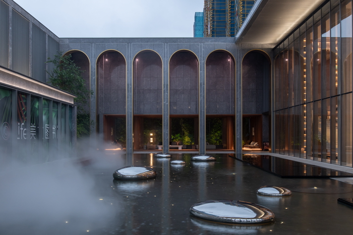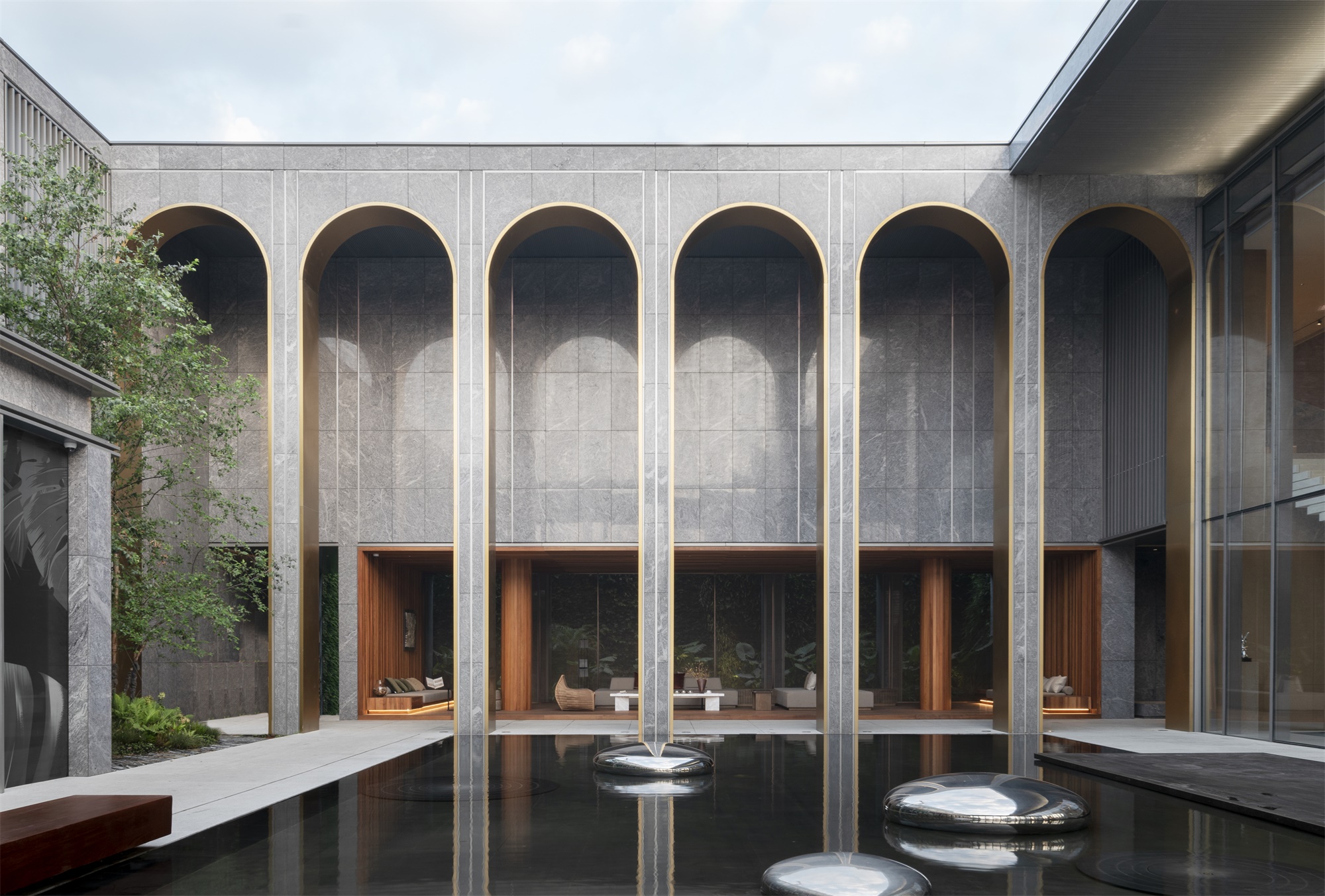 10米挑高的建筑柱廊圈出的內(nèi)庭空間 - “無界秘境”是整個(gè)示范區(qū)最具戲劇感的存在。周圈建筑立面顯著的豎線條形成強(qiáng)烈的韻律感。