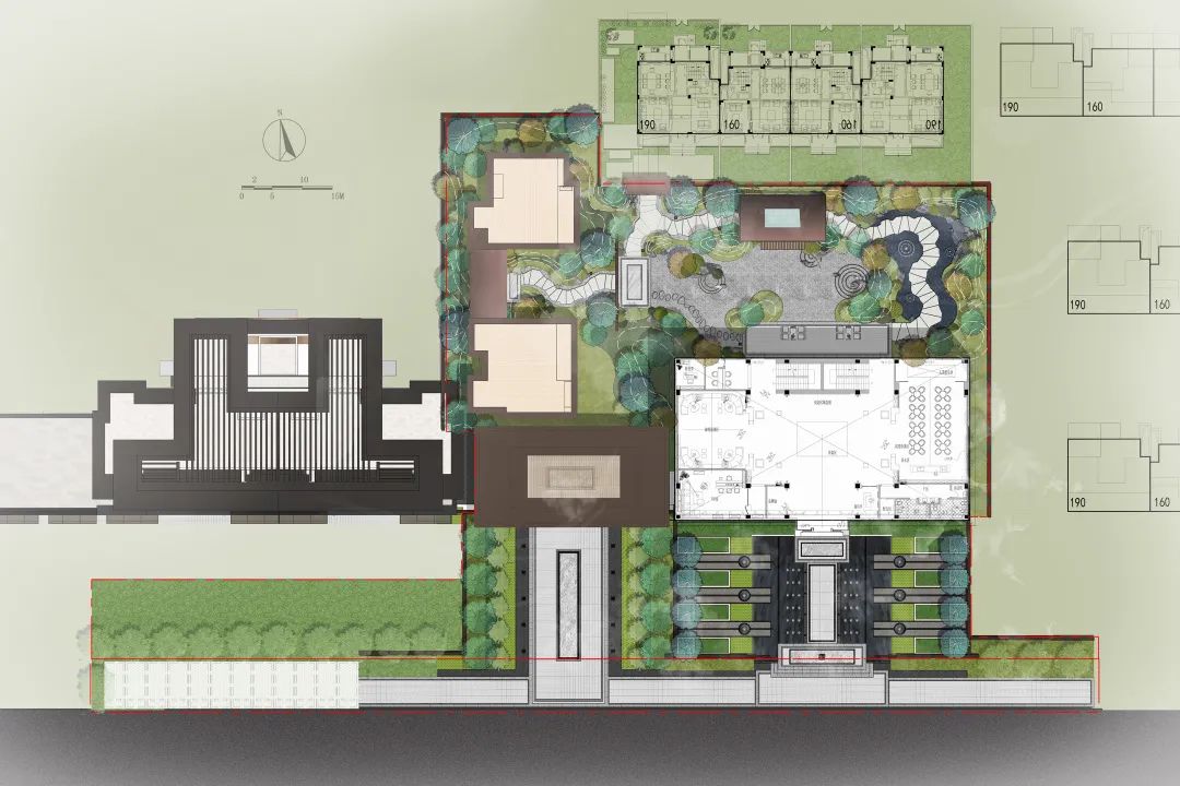 景觀設(shè)計(jì)將北側(cè)入口空間界定為城市展示界面,需要在回避場(chǎng)地外的不利條件的同時(shí),解決銷(xiāo)售期間的停車(chē)、下客、接待等功能。