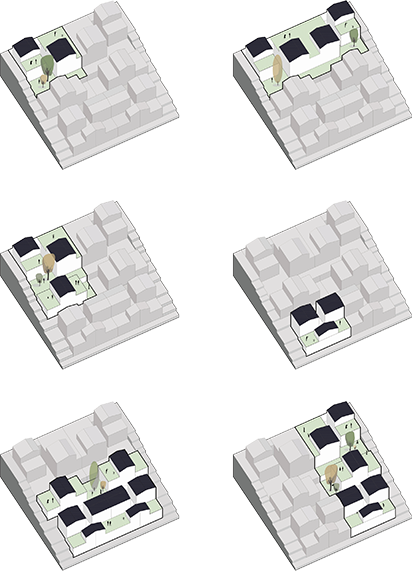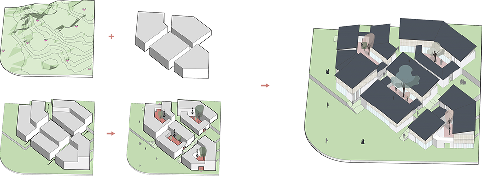 由不同大小16戶組成的合院模塊,以實(shí)現(xiàn)小面積、多組合、可經(jīng)營的運(yùn)營策略。建筑與山形產(chǎn)生共振,布局順應(yīng)地勢,形成不同高程不同形式的入戶空間,做到每戶均有獨(dú)立的入戶和私家庭院,入戶流線移步異景,體驗(yàn)豐富。