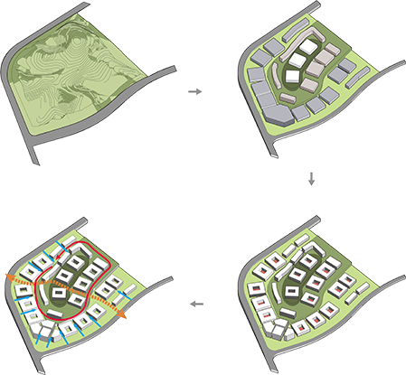 整體規(guī)劃采用大開放小圍合的設(shè)計(jì)理念,開放的山街步道與相對(duì)獨(dú)立的組團(tuán)合院,形成空間的收放韻律。設(shè)計(jì)尊重原始地形,建筑順應(yīng)地勢而建,由一個(gè)個(gè)標(biāo)準(zhǔn)組團(tuán)及精品民宿區(qū)形成覆蓋山丘的山居聚落,橫向山街與縱向的上山步道,將各組團(tuán)有機(jī)的聯(lián)系在一起,建筑低矮地趴在山丘上,傳承著”覆壓三百余里,隔離天日“的中國傳統(tǒng)組群院落精神,連續(xù)流動(dòng)且橫向漂浮著。