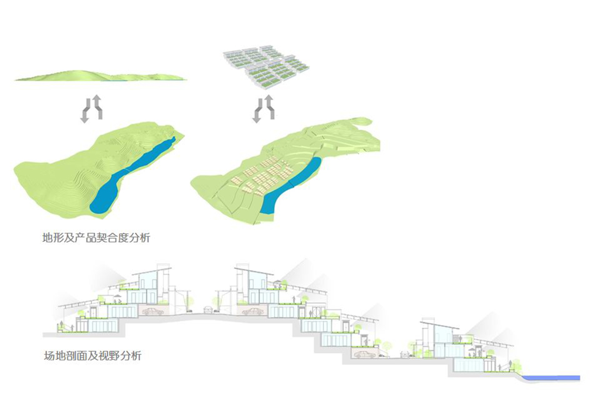 本項(xiàng)目度假小鎮(zhèn)是山地度假疊墅。設(shè)計充分利用現(xiàn)有自然條件,結(jié)合地形,將建筑與自然有機(jī)融合,形成生態(tài)的休憩之所。別墅套型按產(chǎn)品面積大小分為 60平方米、80 平方米、120 平方米三種戶型,將三種戶型產(chǎn)品根據(jù)地形進(jìn)行組合疊加,形成兩疊、三疊及四疊的跌落式產(chǎn)品。