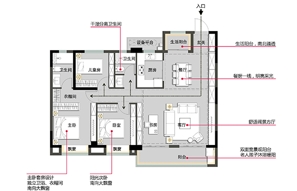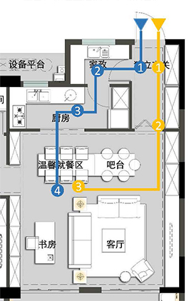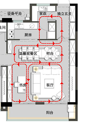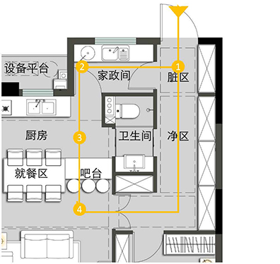 該洄游將入戶分為“家政動線”與“居家動線”?!凹艺泳€”:玄關(guān)-家政間-廚房-餐客廳 動線,當(dāng)買菜回家,或手上有重物回家時,先步入家政間處理,不必經(jīng)過客廳、餐廳,避免傳統(tǒng)戶型中,入戶動線不分離帶來的污漬、污染等情況。 “居家動線”:玄關(guān)-過廳-餐客廳等,讓家人或訪客直接通過玄關(guān)進入客廳等空間,相較于傳統(tǒng)入戶動線,避免與家政動線的重合,保證生活的干凈與從容。