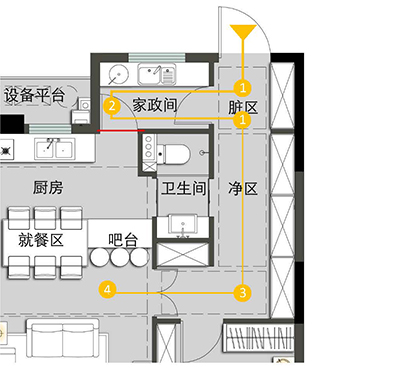 如是非常時期,家政間與廚房間聯(lián)通關(guān)閉,家政間作為家用洗消間,外出歸來、洗消之后保護家人的安全!
