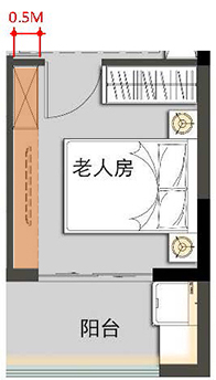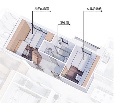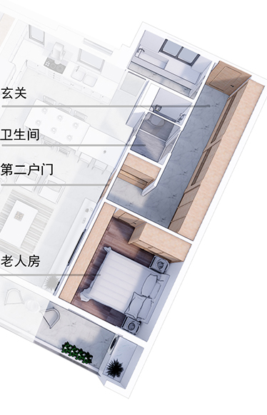 內(nèi)外兩道推拉門控制衛(wèi)生間的可分可合,白天作為公共衛(wèi)生間、晚上組合成老人套房。