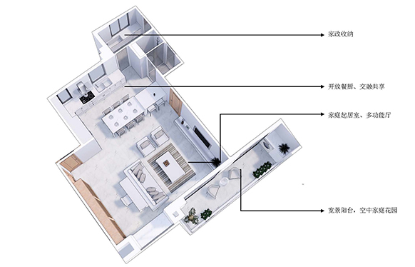 視覺放大、交融共享中體驗到家庭的溫情;媽媽在忙碌于廚房時可以看到寶寶在玩耍,爸爸與爺爺在聊天,奶奶在空中花園中擺弄著......這個場景叫做“溫馨”。